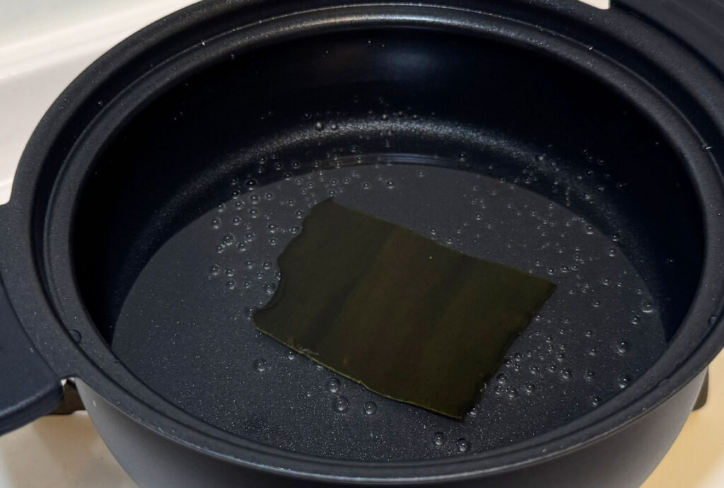 鍋に水(1〜1.2L程度)と昆布を入れ、弱火〜中火でじっくり加熱します。沸騰する直前に昆布を取り出すのが重要なポイント。沸騰してから取り出すと出汁が濁ったり、えぐみが出たりする原因になります。昆布の旨みがしっかり溶け出した、透き通った黄金色の出汁が理想です。
