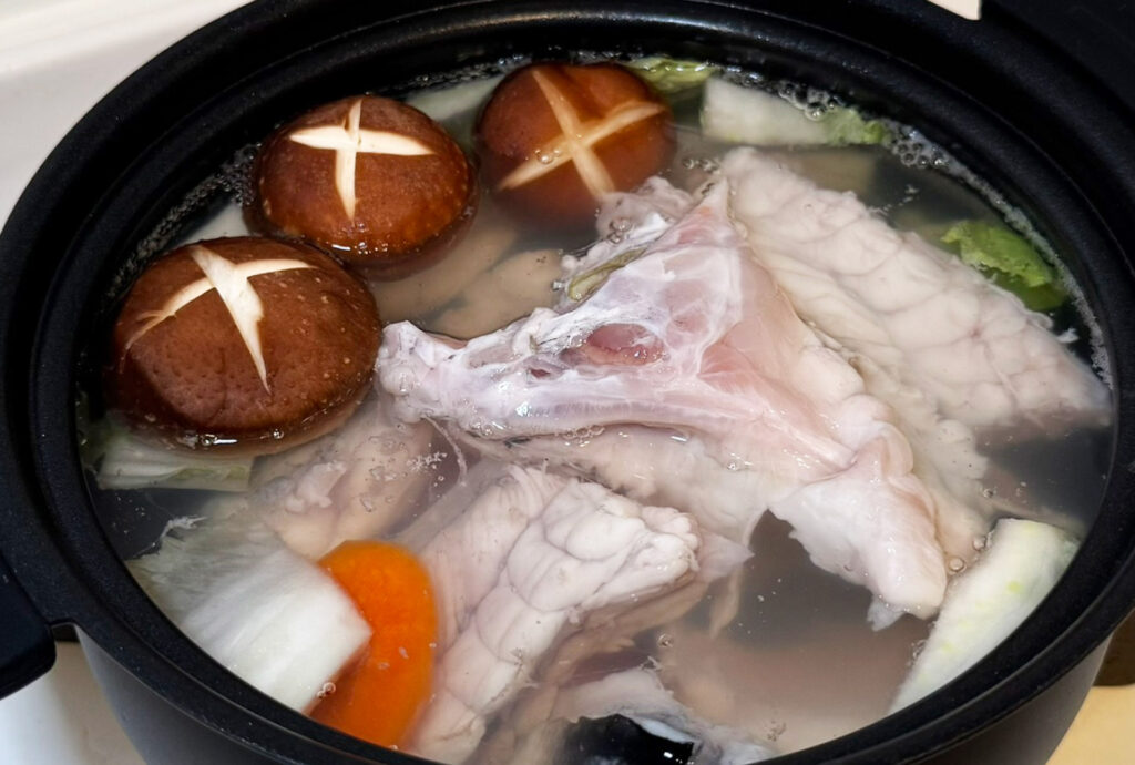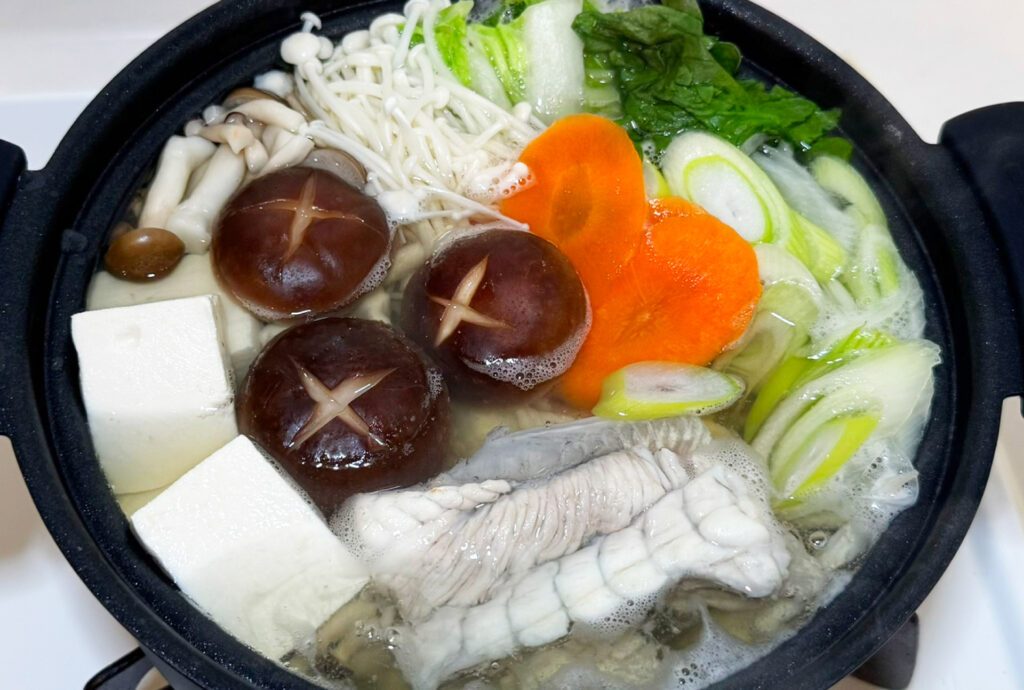 ふぐ皮がある場合:野菜を入れた後に加えるのがおすすめです。薄いふぐ皮がぷるぷるとしたコラーゲンたっぷりの食感になり、さらに美味しく仕上がります。