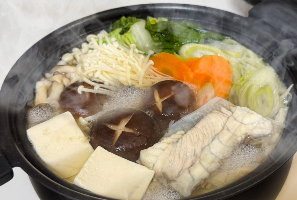 火の通りにくいものから順に投入するのが基本です。豆腐・しいたけ・白菜の芯の部分を先に入れ、蓋をして中火で10〜15分ほど煮込みます。その後、えのき・白菜の葉・春菊を加えて軽く火を通します。